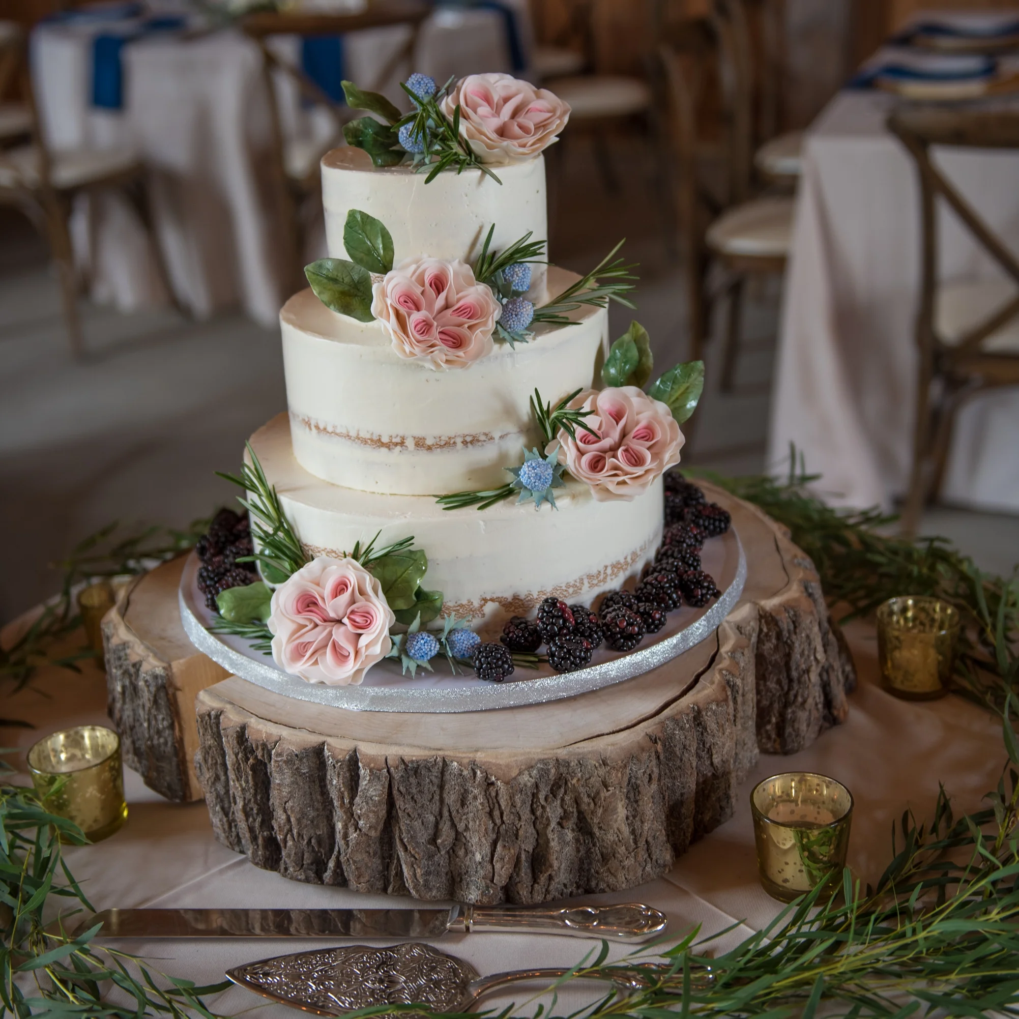 Delicate gold touches, candlelight and blush florals created a warm elegance in the barn.
